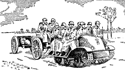 Тут, однако, конная тяга все больше и больше уступает механической. Мотор, можно сказать, здесь почти уже вытеснил лошадь. Трактор стал основным средством для перевозки тяжелой артиллерии (рис. 334).