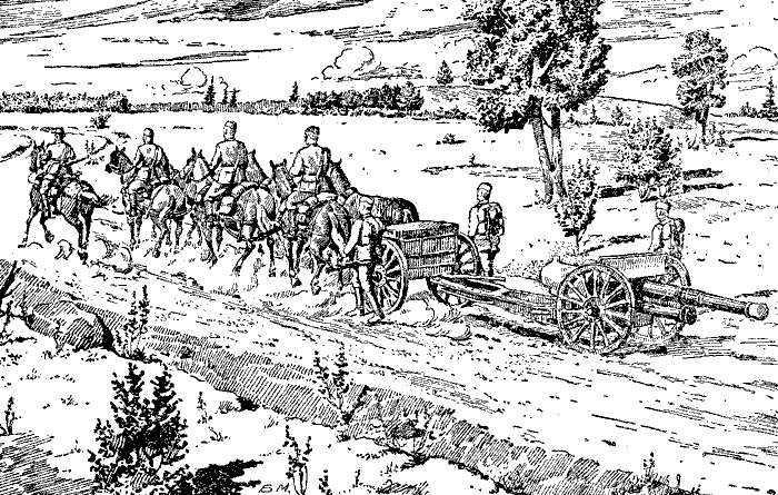 Рис. 329. 76-миллиметровая полковая пушка с зарядным ящиком на походе