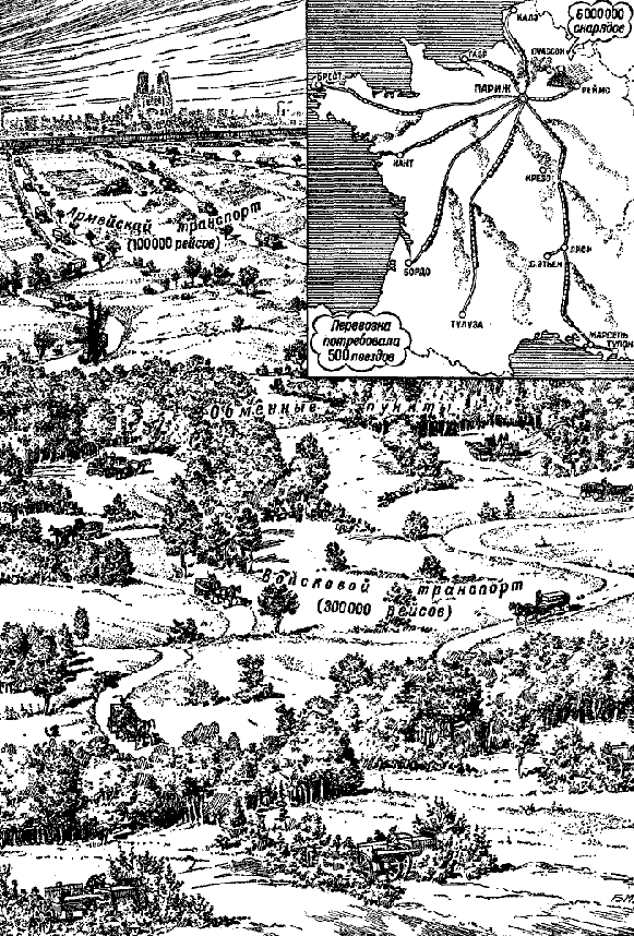 И вот со всей страны потянулись на фронт эшелоны. Для перевозки только тех 6 миллионов снарядов, которые предназначены были для прорыва на реке Эн, потребовалось свыше 500 поездов (рис. 341).
