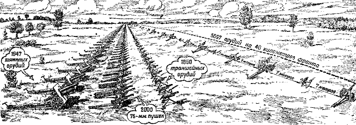 Всего 5 597 орудий, то-есть на 1 000 с лишним орудий больше, чем имела вся французская армия к началу мировой войны. И все это на фронте шириной в 40 километров! Каждую полоску германских позиций шириной в 7 метров будет громить одно из французских орудий.