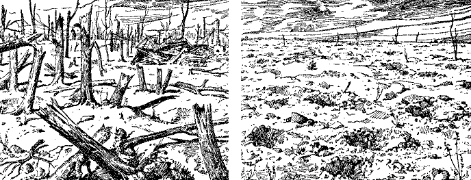 Вся местность была как бы «перепахана» чудовищным плугом войны. Немецкие окопы и укрепления были разрушены и сравнены с землей. Кусты, леса, деревни и небольшие холмы перестали существовать. Поверхность земли представляла собой море воронок (рис. 344).