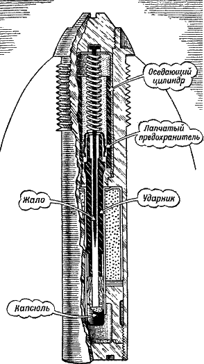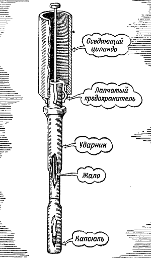 Пока снаряд летит, капсюль не касается жала: их разделяет расстояние в несколько сантиметров. Но вот летящий с большой скоростью снаряд налетает на преграду и резко тормозится. Тяжелый ударник продолжает еще по инерции двигаться вперед вместе с находящимся на его дне капсюлем.