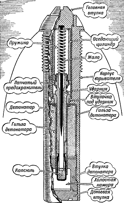 Для этого, как видно из рисунков 62 и 64, на ударник надевают сверху медный «лапчатый предохранитель». Своими лапками он упирается в медный «оседающий цилиндр». Этот оседающий цилиндр и не дает ударнику сдвинуться вперед, если снаряд встряхнуло на ухабе или его уронили при переноске.