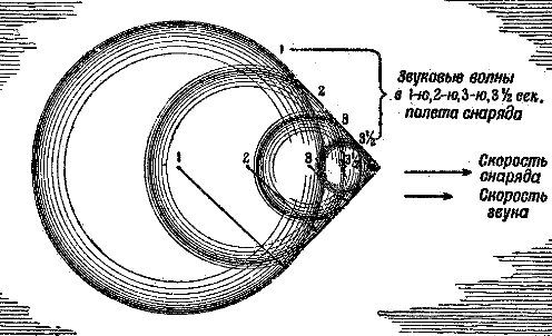 В этом случае снаряд обгоняет все волны, образующиеся перед его головной частью (рис. 107).