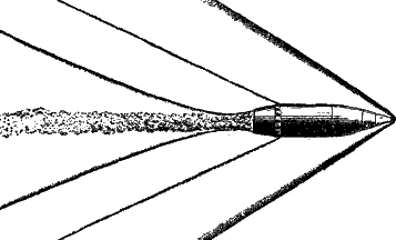 Рис. 108. Если бы снаряд с плоской поверхностью вылетел со сверхзвуковой скоростью, он вызвал бы огромное сопротивление воздуха и через короткое время потерял бы свою скорость