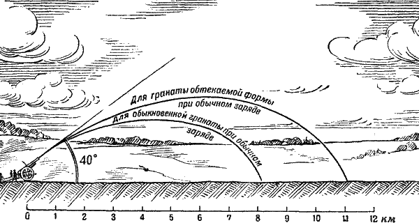 Рис. 111. Увеличение дальности полета снаряда при улучшении его формы