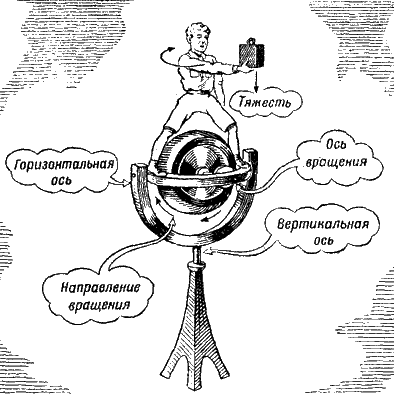 Вы думаете, вращающийся гироскоп наклонится вниз, в сторону груза? Ничуть не бывало: гироскоп повернется вокруг своей вертикальной оси слева направо.