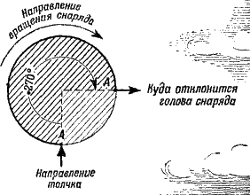 Рис. 122. Как отражается на вращающемся снаряде полученный им толчок