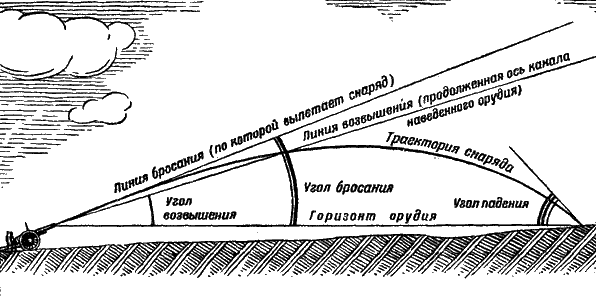 На самом деле траектория всегда несимметрична: дальняя – нисходящая – ветвь у нее круче и короче восходящей, и снаряд падает круче, чем вылетает из орудия, то-есть угол падения снаряда всегда больше угла бросания (рис. 126).