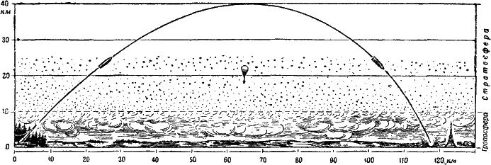 Снаряд этого орудия быстро пробивал нижний плотный слой воздуха и вырывался на простор стратосферы, входя в нее под углом в 45 градусов, то-есть как раз под углом наибольшей дальности полета в безвоздушном пространстве (рис. 129).