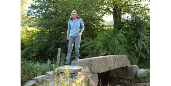 Игорь настроил камеру, и я еще раз прошлась в постановочном кадре по длинному цельному камню, можно сказать, дольмену, через прозрачный ручей.