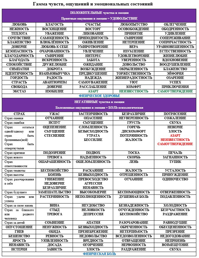 Для идентификации ценных чувств и эмоций, воспользуйтесь табличкой «Гамма чувств, ощущений и эмоциональных состояний».