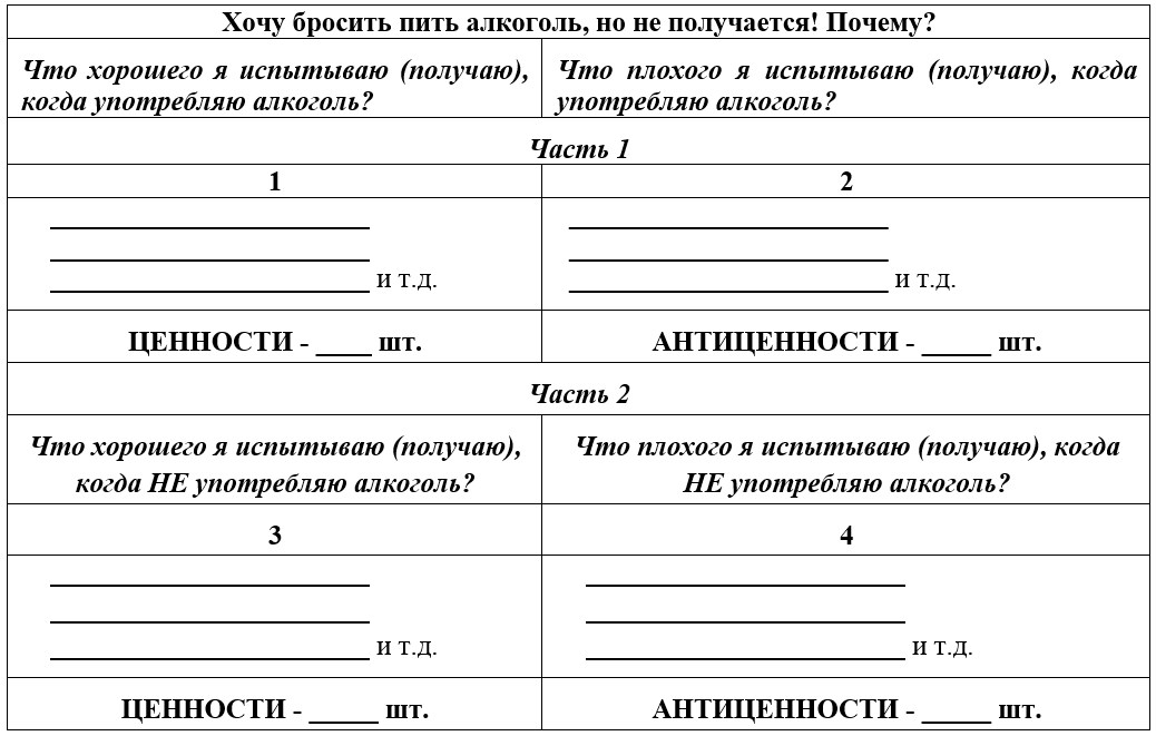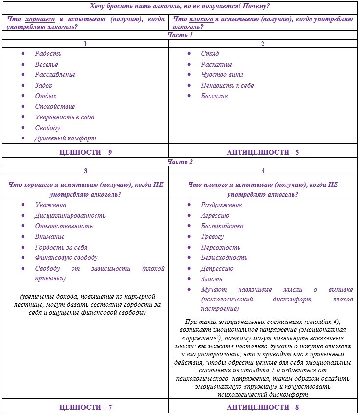 И в 1-ой и 2-ой части таблицы виден конфликт ценностей: «Хочу избавиться от алкогольной зависимости, но по определенным причинам не могу этого сделать».