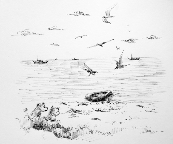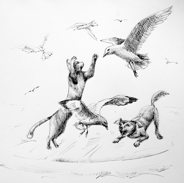 Естественно, Кузя не мог позволить им одержать победу над своей сестрёнкой, поэтому громко залаяв, отважно бросился ей на помощь. Чайки поняли, что теперь им нелегко будет справиться с кошкой, ведь у них появился новый противник, не менее опасный.