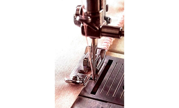 Изделие или ткань накладывают под лапку машины лицевой стороной вверх и так, чтобы линия наметки располагалась по середине между иглами. Опускают лапку на материал и строчат. С лицевой сторон должны быть две рядом идущие параллельные строчки, а с изнаночной стороны – зигзагообразная строчка, закрывающая срез материала. Данная зигзагообразная строчка получается без переключения машины в режим «зигзаг».