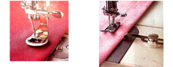 Лапка фиксирует положение пуговицы на ткани, в то время как игла выполняет зигзагообразные движения, опускаясь то в одно, то в другое отверстие. С помощью такого приспособления можно очень быстро пришить целый ряд пуговиц на застежке.