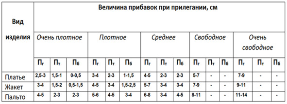Прибавка на свободное облегание необходима для обеспечения санитарно-гигиенических условий, свободы движения, воздушной прослойки и декоративно-конструктивных требований в зависимости от покроя изделия. Также величина прибавок зависит от толщины тканей и назначения одежды.