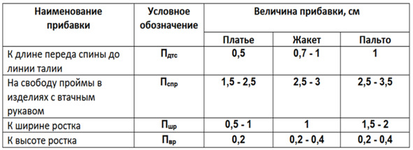 Прибавки обозначаются заглавной буквой П, а малые буквы при заглавной обозначают участки прибавок. Прибавки даются к ширине изделия по линии полуобхвата груди второго Пг, к полуобхвату талии Пт, полуобхвату бедер Пб, длине изделия Пди, длине талии спинки Пдтс и переда Пдтп, на свободу проймы по глубине Пспр, к ширине ростка Пвр, к обхвату плеча на ширину рукава Поп.