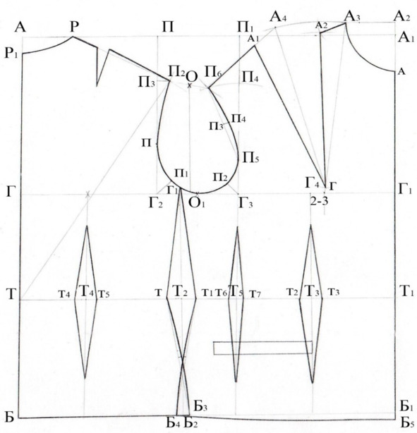 Строится прямоугольник: горизонтальные стороны из расчета ширины изделия АА1 = ББ1, а вертикальные стороны из расчета длины изделия, АБ – середина спинки, А1Б1 – середина переда. Из точки Т проводится горизонтальная линия. На пересечении с вертикальной линией середины переда ставится точка Т1 (линия талии).