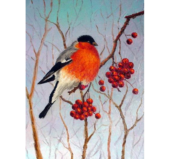 Красавица-зима:В инее дома,Деревья и кусты,Белые мосты.На ветках, посмотри,Снова снегири,Как важные купцы,Вот так молодцы!На веточках сидят,Ягоды едят:Красную рябинку,Сладкую калинку.Снеговик и пуховик