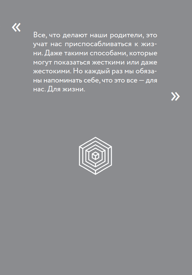 Сохранить жизнь непросто. Для этого надо быть сильным, целеустремленным, упорным, гибким, каким угодно еще. Ведь есть разные стратегии в жизни. И все, что делают наши родители, это учат нас к этой жизни приспосабливаться. Даже такими способами, которые могут показаться жесткими или даже жестокими. Но каждый раз мы обязаны напоминать себе, что это все – для нас. Для жизни.