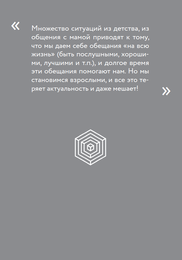 Каждый может найти у себя такую историю – и такое обещание. И долгие годы, кстати, эти обещания могут быть нашей стратегией выживания. Ведь в каждом из них таится своя движущая сила. Пока мы растем, мы получаем свои бонусы за «послушность» и «хорошесть»: становимся лидерами в школе, оказываемся на хорошем счету в институте. Но затем наступает время, когда от подобных обещаний надо отказываться, потому что пора взрослеть.