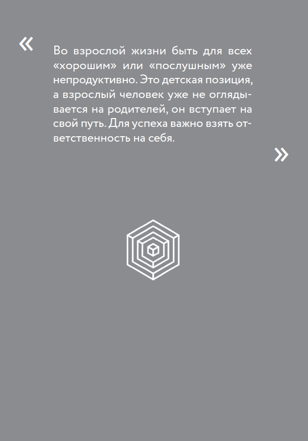 Во взрослой жизни быть для всех «хорошим» уже непродуктивно. Это детская позиция, которая не дает нам достигать собственных целей. Как быть невидимкой («я малыш, я ничего не умею, сделайте все за меня»), как кому-то что-то доказывать («я сам, я лучше знаю»). Взрослый человек уже не оглядывается на родителей, не ищет их одобрения или одобрения других взрослых. Он вступает на свой путь и ориентируется только на себя.