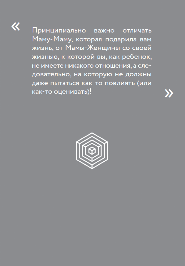 Ваши дети или друзья никак не могут повлиять на вашу роль в системе с работой, например, или бывшими партнерами. Только вы можете влиять на свое место и свой функционал. Не может же ребенок прийти к вам с запросом «Пожалуйста, не разводитесь, потому что я так не хочу». Это очевидный перекос в системе. У ребенка нет такой «должностной инструкции», он не может руководить взрослыми. И точно так же мы, будучи детьми в родительской системе, не можем никак влиять на жизнь Мамы-Женщины. Мы можем быть только ребенком Мамы-Мамы – и все.