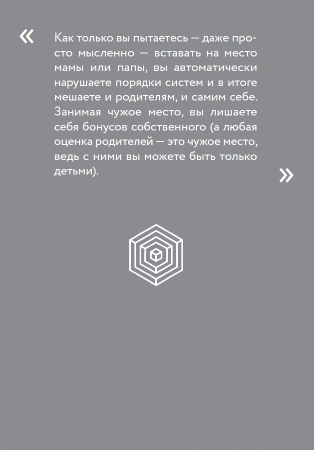 • Вам казалось, что мама неправильно ведет себя с папой, бабушкой, тетей? Но теперь-то вы понимаете, что это вас вообще никак не касается? Это не ваша система, вас в ней нет. Вы есть только там, где Мама-Мама. Помните, мы говорили, что в системе «Я и родители» только такие элементы: родители и ребенок/дети. Следовательно, там, где Мама-Женщина, нет места ребенку, он просто не предусмотрен в качестве элемента тех систем. Разве в системе «Работа» есть дети? Нет, там есть владелец бизнеса, руководитель, коллеги. Никаких детей. Разве в системе «Мама и ее родители» есть внуки? Нет, там то же самое: мама, папа и ребенок/дети (там есть мамины братья, сестры, но вас там нет!). Разве в системе «Муж и жена» есть дети? Вот тут чуть сложнее, но попытайтесь понять. Там есть только партнеры! Дети – это уже снова система «Я и родители». И так далее, и тому подобное…