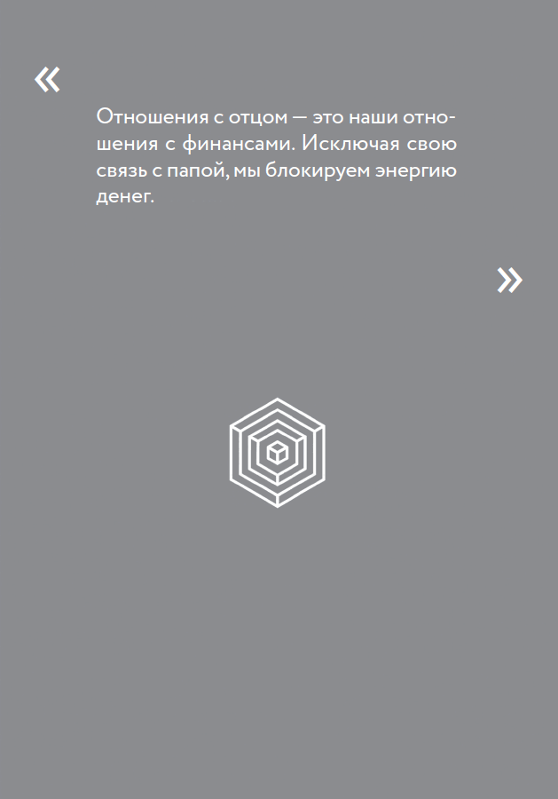• Папа в каждом человеке отвечает за деньги, выход в мир, уверенность, масштабирование, внутренний стержень, способность достигать целей и развитие (потому что зона ответственности Мужчины, Мужа – внешнее состояние, внешние границы),