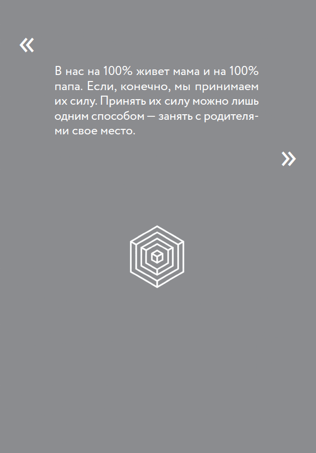 Один из первых и важнейших шагов к нашему личному олимпу (вспоминаем, с чего мы начинали) – это свое место с родителями. Базис. Фундамент. Мы все пришли однажды в этот мир в родительскую семью. Мы прежде всего дети своих родителей. В нас на 100 % живет мама и на 100 % папа. Если, конечно, мы принимаем их силу. Принять их силу можно лишь одним способом – занять с родителями свое место.