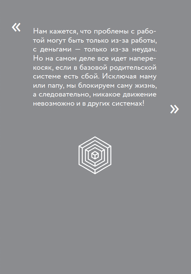 Иными словами, пока вас нет на вашем месте, у вас нет и никаких бонусов. Именно поэтому так часто, когда не клеятся отношения с родителями или остались в семье незавершенные вопросы, и в жизни все идет наперекосяк. Нам кажется, что проблемы с работой могут быть только из-за работы, с деньгами – только из-за неудач. Но на самом деле мы уже не раз говорили о том, что все системы взаимосвязаны. И если в базовой системе идет сбой, если блокируется сама жизнь (путем исключения мамы или папы), то никакое движение невозможно и в других системах! Никаких ДОЗ, никакого «пакета опций» и никаких мощнейших ресурсов рода со стороны Папы и Мамы. Ведь, повторюсь, принять у себя можно лишь одним способом: встать на свое место с родителями.
