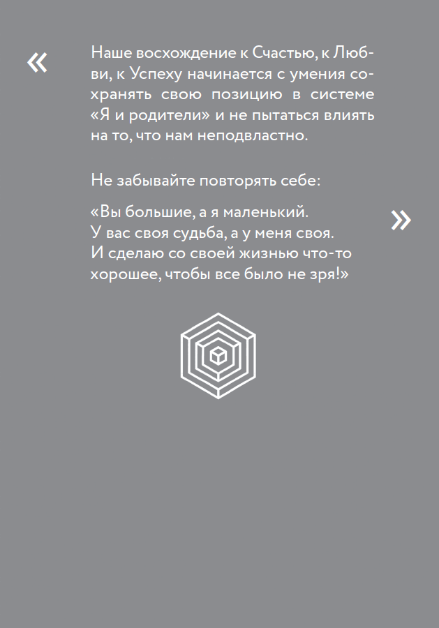 И если вы хотите в жизни успеха по всем фронтам, то мама и папа должны быть в вашем сердце на все 100 %. Оставляйте себе только Маму-Маму и Папу-Папу, ваших родителей, а просто взрослые люди с их разнообразной, подчас непростой судьбой пусть сами живут свою жизнь, без вашего участия. Берите все 200 % от них и все мыслимые и немыслимые проценты от родных, поскольку тогда точно не будет никаких преград на пути к счастью, потому что в нас соединятся все силы наших предков, а мы сможем передать их дальше.