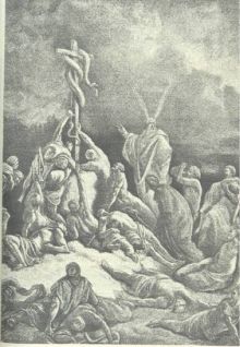 И все же потери от укусов змей были настолько велики, а тяжело заболевших было такое множество, что Моисей, по внушению Бога, приказал выковать из меди фигуру извивающегося змея. Подвешенный на высоком шесте медный змей обладал чудодейственной исцеляющей силой: каждый прикасавшийся к нему или даже просто взиравший на него быстро выздоравливал.