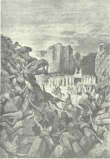 На седьмой день, во время очередного шествия, высокие серебряные трубы, казавшиеся дотоле безмолвным украшением, вдруг оглушительно взревели. Звук их был так силен и ужасен, что, смешавшись с воинственными воплями многотысячных толп народа, потряс и разрушил стены крепости. Накренились и упали его башни, рухнули бойницы, а по ним через завалы и проломы широким потоком ринулись войска и толпы израильтян.