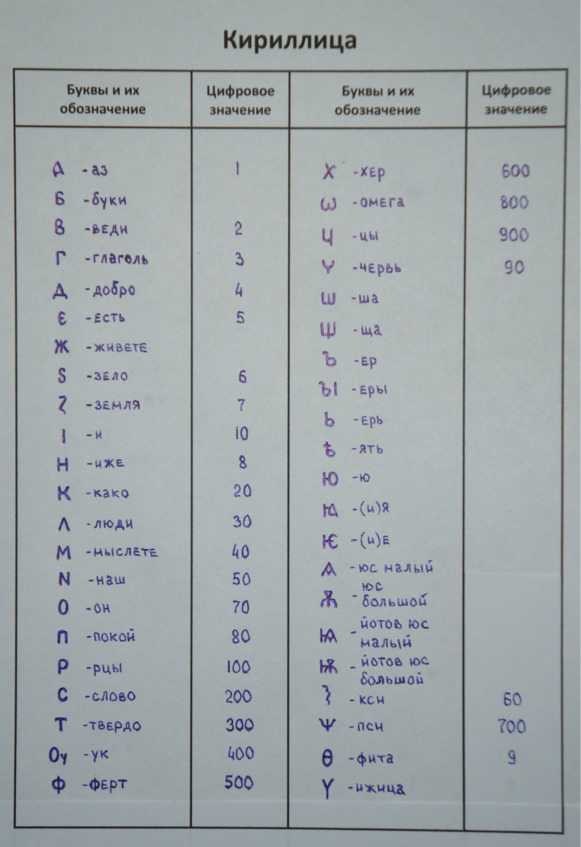 В смысловом окончании первой части кириллицы сочетание «ук ферт» (указываю (примером) на веру, разъясняю веру) ко всем православным обращено и, в вариации его, в предназначении помогать прихожанам, принято на себя церковью. Интересно, что буквы «цы»/«червь» кириллицы в древнерусской рунице соотносились с буквой, похожей по форме на церковный крест (вывод на основе книги «Руница и тайны археологии Руси»2). То есть вера при переходе на кириллицу стала отождествляться с положительной энергией «цы» и отделены были сомнения («червь»). И здесь важно чтобы Вера была исконная, истинная, разрешающая (в понимании разрешивающая, та, которая дает решения) внутренние сомнения в сердце своем. Так, полагаю, Русским людям есть что искать как в современной церкви, так и понять в миру: через кириллицу (через глубинное понимание слов русских (через буквы, како отражение всеобъемлющего, веденье, связанное с цы, для аз несущее), потому как жив еще исконный русский язык в языке современном и тем он сильней чем больше говорят на нем, сохраняя, даже без понимания на то и тем низменней попытки посягнуть на него), у староверов и старообрядцев, если возможно найти еще таковых; в книгах духоборцев (подвижник системы оздоровления, принимаемой в России, Мирзакарим Норбеков и его ранняя книга «Работай над собой!»3; создатель собственной оздоровительной, построенной на физике тела, практики «Белояр» Станислав Жуков (сайт Beloyar.ru); создатель (тот, кто в данном случае воспринял «слова объемлющего» «силу», разъяснив и дав) центра самотрансформации личности и дыхания Александр Свияш (сайт Sviyash.ru) и другие); да и в жизни новых подвижников Руси есть что почерпнуть (иных русских фермеров и хозяйственников, коих сейчас не мало). К слову, вычитал о таком факте и очень благодарен Льву Николаевичу Толстому (годы жизни 1828—1910) за то, что он спас множество духоборцев от гонений во времена Романовых. Ведаю, что потому он был истинно верующий человек.