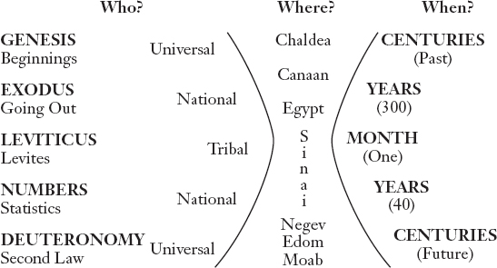 When we ask who these books are about, we begin to see the shape emerging. Genesis is a universal book – it is about everybody, the human race and the whole universe. Exodus is a national book – it zooms down on one people, the nation of Israel. In Leviticus the focus is even more narrow, on only one tribe out of the whole nation. Once past Leviticus, the focus opens out again and Numbers is about the whole nation once more. Deuteronomy puts Israel against the backcloth of the entire world and we are back to the universal viewpoint.