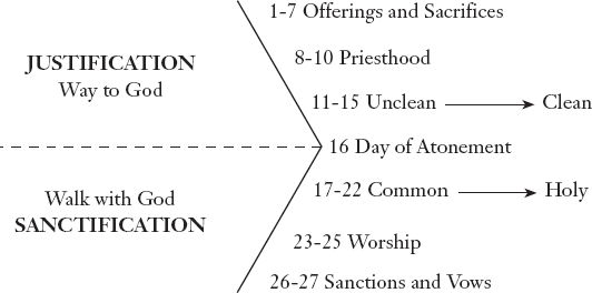 The two sections of the book pivot around the Day of Atonement. The first half describes our way to God – what we call justification – and the second half describes our walk with God – what is known as sanctification.