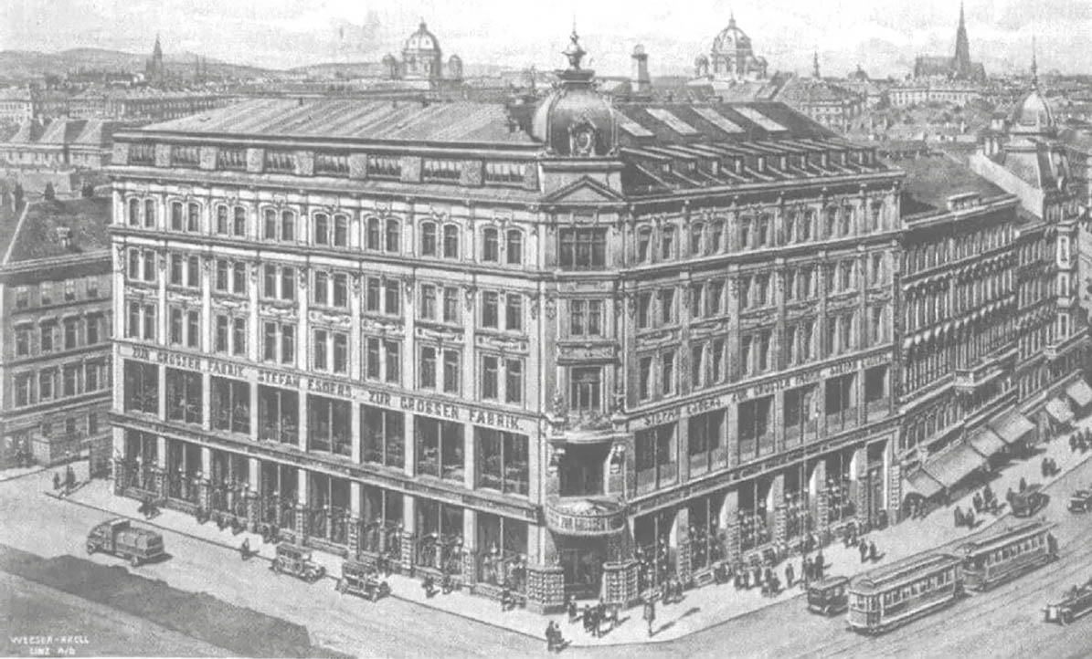 Stefan Esders (1852–1920) stammte ursprünglich aus Belgien und hatte zuvor schon eine Kleiderfabrik in Brüssel gegründet, gemeinsam mit seinem Bruder Henri. Zahlreiche Filialen in Berlin, Paris, St. Petersburg und Rotterdam waren bereits entstanden, nun sollte in der aufstrebenden Weltmetropole Wien ein weiterer unternehmerischer Höhepunkt folgen. Esders erwarb das Eckgrundstück in der Mariahilfer Straße 18 und ließ nach Plänen des Wiener Architekten Friedrich Schachner ein für damalige Verhältnisse spektakuläres Großkaufhaus für Textilwaren errichten. Die Vorbilder dazu standen in Paris, wo sich mit legendären Etablissements wie Le Bon Marché, La Samaritaine oder Printemps bereits seit Längerem eine prominente Warenhauskultur etabliert hatte.