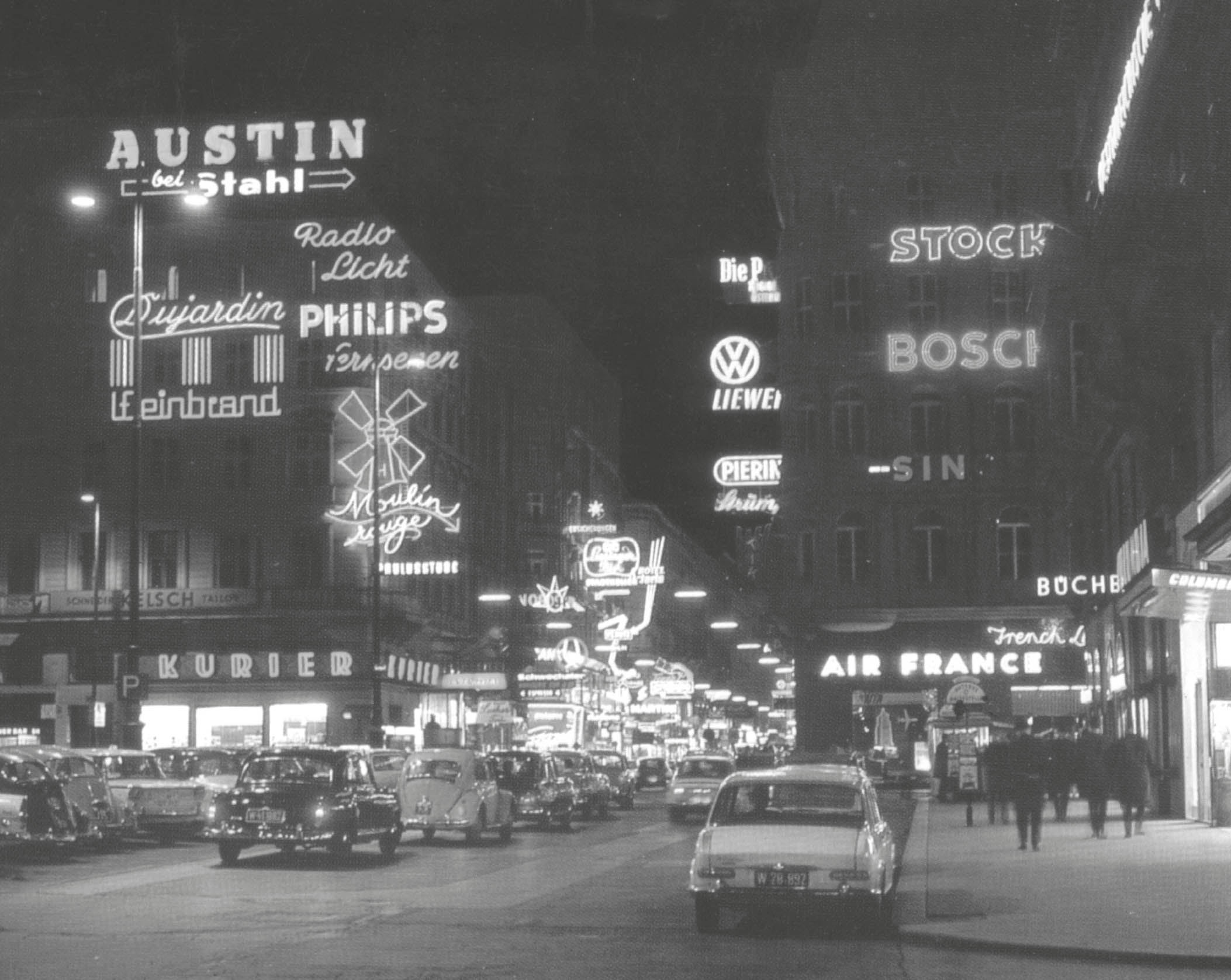 Mehr als 7.000 Lichtreklamen gab es im Jahr 1932 bereits in Wien, eine Zahl, die im Jahrzehnt zuvor rasant gestiegen war. Vor allem nachdem zu den punktförmig leuchtenden Glühlampen die Neonröhre hinzugekommen war, die kontinuierliche Lichtbänder in allen erdenklichen Formen und Farben ermöglichte.