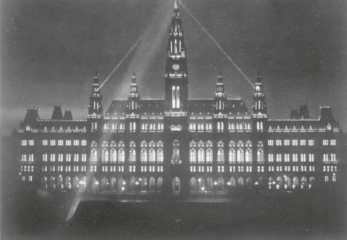 »Kein Fest mehr ohne Lichtfreude.« Dieses Motto sollte dann auch bei politischen Veranstaltungen der Zwischenkriegszeit zur Selbstverständlichkeit werden. Schon die Feier zur Eröffnung des für die Wiener Stromversorgung wichtigen Kraftwerks in Opponitz am 1. Jänner 1925 wurde von einer aufwändigen Lichtinszenierung begleitet. Diese verstand sich als politisches Statement für die wachsende Kraft der Sozialdemokratie und die Potenz einer Stadt, die eben erst zu einem eigenen Bundesland erhoben worden war. Im Zentrum des Spektakels stand die politische Machtzentrale, das Rathaus, welches an diesem Abend gleich zweimal (zwischen 17 und 18 Uhr sowie zwischen 20 und 21 Uhr) im Lichterglanz erstrahlte. Schon am Nachmittag setzte, so die »Neue Freie Presse«, eine »Völkerwanderung« Richtung Rathausplatz ein, ehe die eigentliche Lichtshow begann: »Da zerreißt der Lichtkegel eines auf dem Rathausplatze aufgestellten Scheinwerfers die Finsternis, taucht die Turmspitze und den eisernen Rathausmann in silberweißes Licht. Gleich darauf flammen auf dem Turm blendendweiße Lampen auf, das Dach strahlt in einem Lichtermeer, mit feurigen Zungen greift das Licht nach immer neuen Loggien und Pfeilern des gotischen Palastes, sie aus dem Dunkel reißend. Und jetzt ist die ganze Fassade des Rathauses mit allen Türmchen, Arkaden und dem reichgegliederten Zierrat von Lichtern übersät, die wie Edelsteine funkeln. Auch von den beiden Ecktürmchen des Rathauses senden zwei Schweinwerfer Lichtbrücken zur Turmspitze hinauf, und der Himmel strahlt im Widerschein des funkelnden Palastes.«