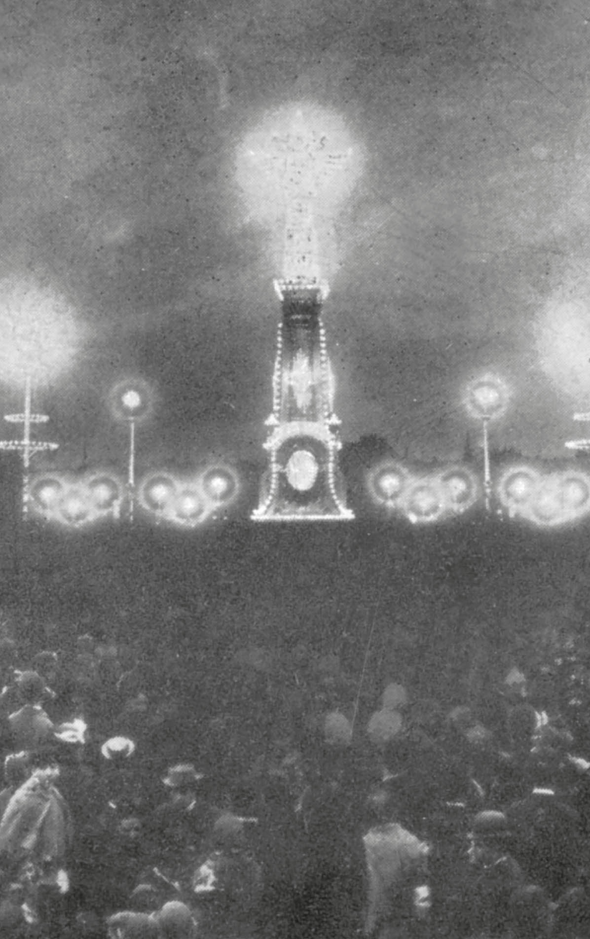Umgekehrt nutzten auch die Christlichsoziale Partei bzw. die Vaterländische Front die Möglichkeiten zur nächtlichen Selbstdarstellung. Als man im September 1933 den »Deutschen Katholikentag« beging, ein politisches und mediales Großereignis, bei dem Engelbert Dollfuß seine berühmte Rede am Trabrennplatz hielt, erstrahlte der Stephansdom als festlich beleuchteter Mittelpunkt der Stadt. Ein Jahr später, nach der Ermordung von Dollfuß, war der Trabrennplatz selbst Schauplatz einer gewaltigen Lichtmanifestation: Zum Gedenken an den Kanzler wurde ein Riesenfeuerwerk entzündet und sein Porträt mitsamt Kruckenkreuz und der Parole »JA ES WILL« in die Nacht gezeichnet. Die Bevölkerung selbst wurde aufgefordert, Kerzen in die Fenster zu stellen und in den Bergen Höhenfeuer zu entzünden.