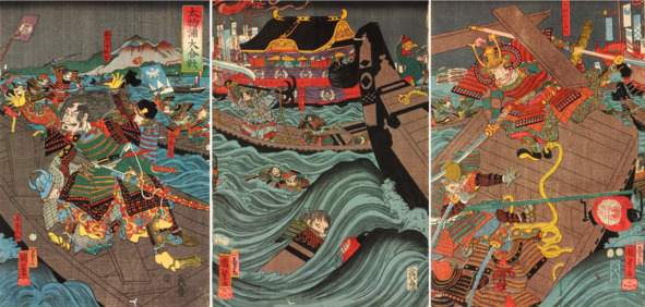 Триптих. Великая битва у Данноура. Последнее сражение между кланами Тайра и Минамото в 1185 году. Утагава Куниеси (1856). Коллекция Британского музея. Общественное достояние. Источник заимствования – ресурсы мировой Сети