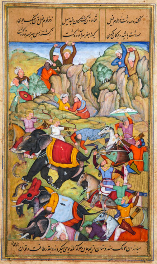 Тимур побеждает султана Дели Насир ад-Дина Махмуда зимой 1397—1398 гг.; миниатюра из Зафарнама Шараф ад-Дина Али Язди (время создания 1595—1600). Императорская библиотека шаха Акбара. Из собраний Института искусств Миннеаполиса, США. Общественное достояние. Источник заимствования – ресурсы мировой Сети.