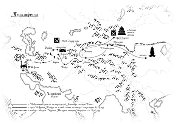 Кочевые моголы (монголы) владели внушительным монолитом темно-зеленого нефрита, который был предметом зависти императоров Поднебесной. Не раз китайцы предлагали моголам золото в обмен на бесценную глыбу и готовы были заплатить столько золота, сколько весил огромный камень. Но кочевники не хотели продавать реликвию – он служил у них своеобразным троном, на который в ходе «коронации»11 торжественно усаживали правителя. Слава об этом «престоле» разнеслась далеко за пределы владения моголов, и сам Тимур в свое время безуспешно пытался им завладеть.