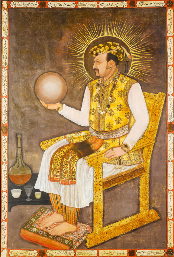 Завоеватель мира Джехангир с земным шаром и неизменным кувшином вина. Джехангир. Прижизненный портрет работы Абу аль Хасана. Частная коллекция. Общественное достояние. Источник заимствования – ресурсы мировой Сети