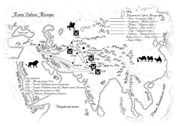 После продолжительной борьбы власть захватил один из сыновей Тимура – Шахрух. Его мало интересовали гражданские и военные дела, большую часть времени он проводил в молитвах и теологических дискуссиях. Но, как и всякий восточный правитель, он знал толк в драгоценностях и при всем своем благочестии и смирении не удержался от искушения увековечить и свое имя на алом самоцвете. В свою очередь и Улугбек, к которому перешел камень, приказал выгравировать свое имя. Потом следы самоцвета теряются. По-видимому, им поочередно владели правящие потомки Тимура, а затем он попал в руки Шейбани-хана, который перехватил власть у Тимуридов14 и вытеснил их из Маверранахра15. Сам Шейбани-хан позже погиб в одном из походов. Одержавший победу шах Исмаил, основатель нового Персидского государства, велел сделать из черепа Шейбани-хана чашу и пил из нее вино в торжественных случаях. Что ж – горе побежденным!