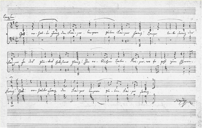 Die erste Strophe des Kaiserlieds von Lorenz Leopold Haschka in der handschriftlichen Klavierfassung von Joseph Haydn, 1797.