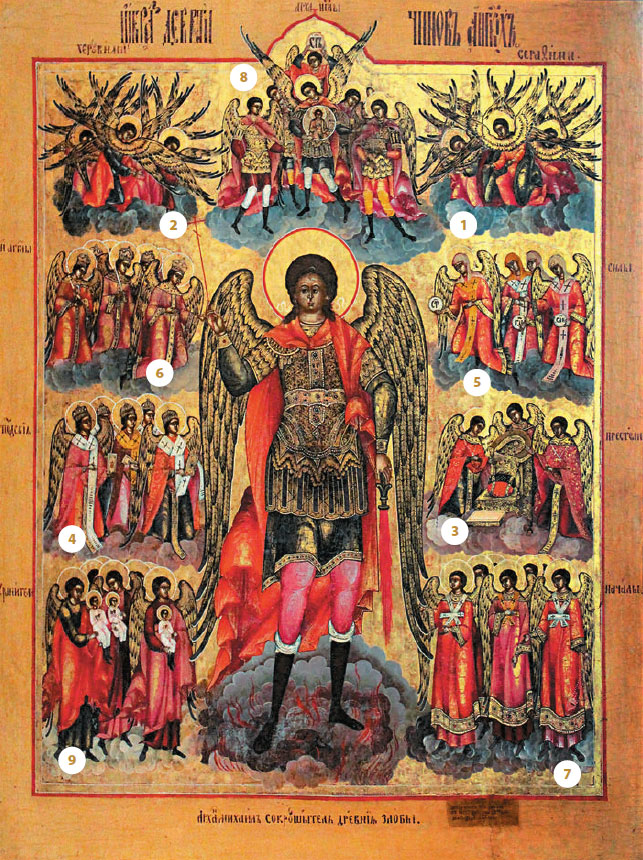 Стоит отметить, что в Священном Писании встречаются девять ангельских чинов. Они описаны в Ареопагитском корпусе – древнегреческом корпусе текстов I века н.э. Иерархия более актуальна для православной традиции. Рассмотрим ее на примере иконы святого Михаила (икона датируется ок. XVII–XVIII вв.).