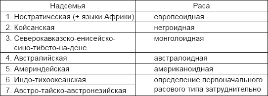 Сложно сказать, являлись ли Адам и Ева африканскими неграми, как это иногда утверждается сегодня, но даже если принять за истину теорию креационизма[9], то никто не может помешать нам выдвинуть то предположение, что человечество произошло вовсе не от одной пары особей, а оказалось сотворено в виде, как минимум, трех достаточно обширных общностей, которые дали начало трем большим расам: европеоидной, монголоидной и негроидной. Несмотря на все многообразие языков, на которых говорит ныне человечество, все это многообразие, очевидно, может быть сведено к нескольким лингвистическим надсемьям, которые в свою очередь могут быть соотнесены с общепринятой классификацией антропологических (расовых) типов (см. Таблица 1)[10].